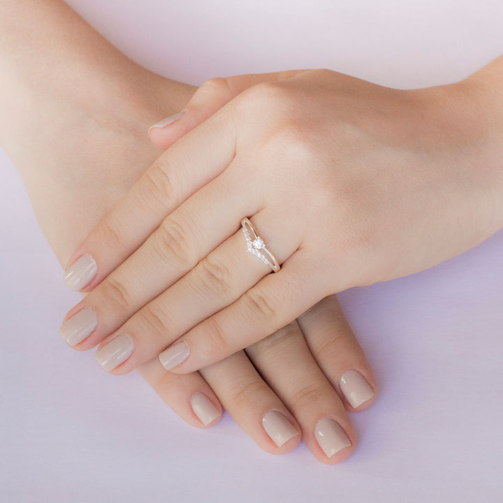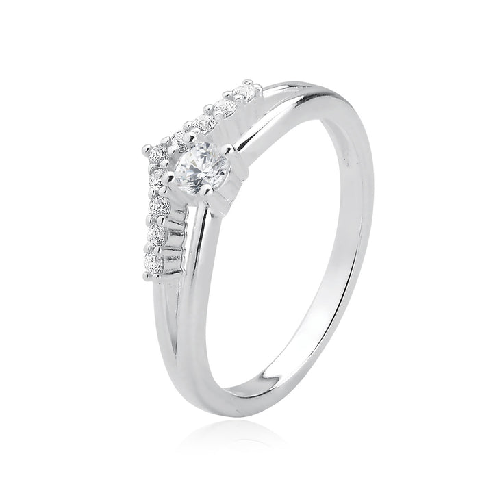 Uma joia que combina delicadeza com imponência. Seu design apresenta duas faixas paralelas de prata 925 que se unem em um formato elegante, remetendo a uma coroa. Uma das faixas é cravejada com pequenas pedras brilhantes de zircônias e finalizada com um delicado solitário na outra faixa. Essa combinação cria um contraste encantador entre o brilho sutil das pedras menores e o destaque do solitário, tornando o anel ideal tanto para ocasiões especiais quanto para o uso diário com um toque de glamour.