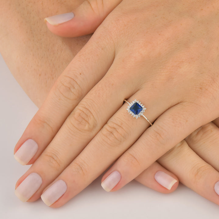 Anel Kate pedra azul Safira quadrada cravejada ao redor