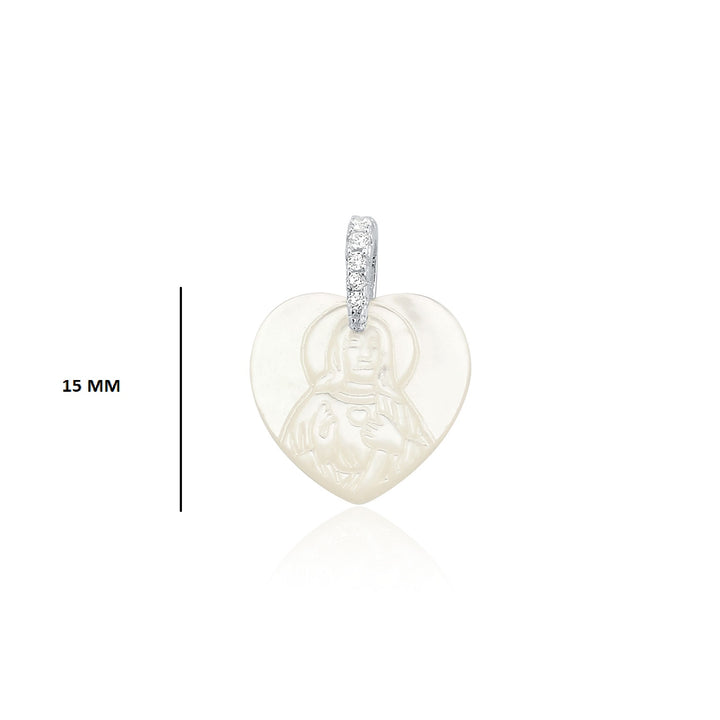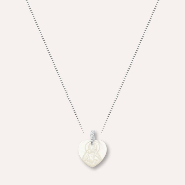 O colar em prata 925 é uma peça elegante e sofisticada, projetada para destacar a beleza e a espiritualidade. Seu pingente esculpido frente e verso traz o Sagrado Coração de Jesus, uma representação profunda de fé e devoção. O pingente é delicado e, ao mesmo tempo, imponente, confeccionado em madrepérola, que confere um brilho suave e iridescente à peça. A madrepérola, com seu acabamento lustroso e as nuances suaves de cores que vão do branco ao creme, adiciona uma beleza natural e serena.