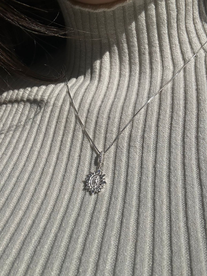 O pingente traz a imagem de Nossa Senhora rodeada por um halo de zircônias cravejadas que acrescentam brilho e destaque à peça, sem perder sua delicadeza. O acabamento refinado e o brilho da prata de lei garantem durabilidade e um toque especial à joia.