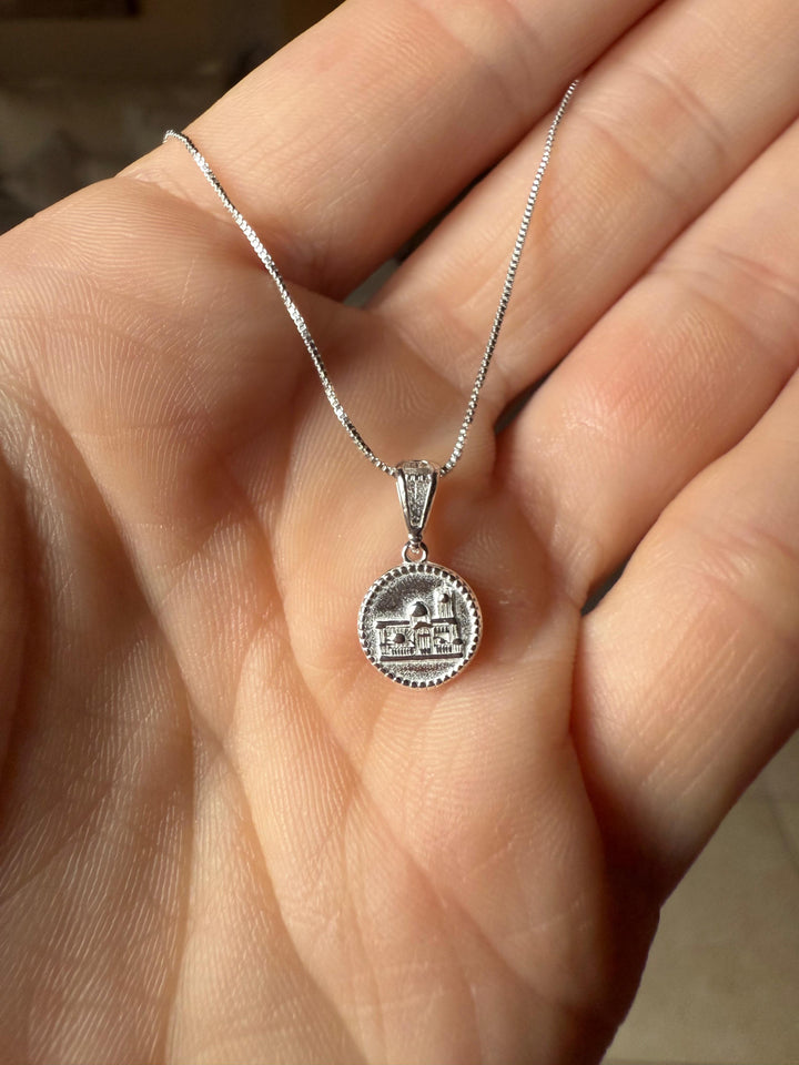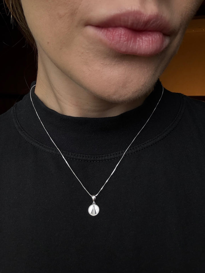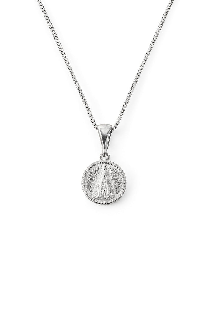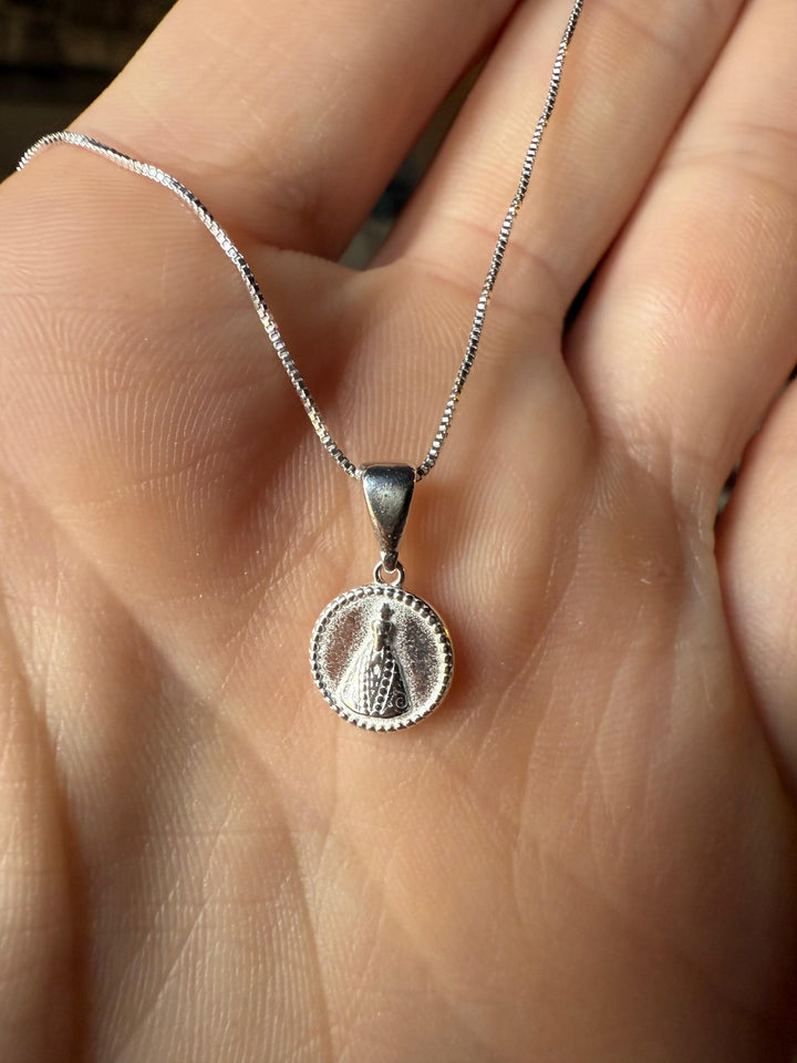 Este colar feminino é uma joia de fé e sofisticação. Confeccionado em prata 925, seu pingente em formato de medalha apresenta, na parte frontal, a imagem de Nossa Senhora com traços delicados e expressão serena, irradiando proteção e espiritualidade e o verso envolta por detalhes ornamentais que remetem à arquitetura de um santuário, simbolizando refúgio e devoção.
