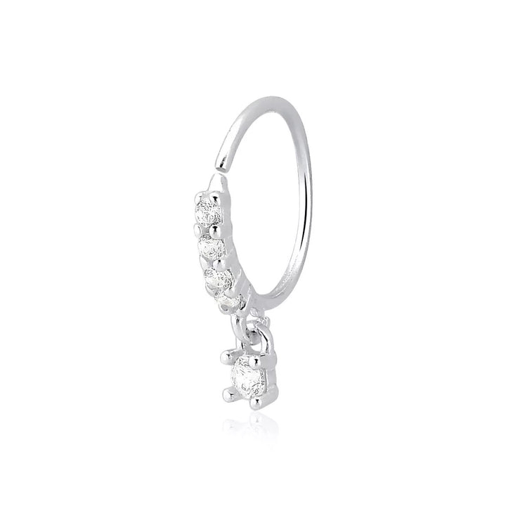 Piercing em Prata 925, modelo argola delicada com acabamento polido, inteiramente cravejada com micro zircônias brilhantes, que garantem um toque de luxo e sofisticação. Possui um pingente pendurado que confere movimento e charme extra à peça, tornando-a perfeita para compor produções modernas e elegantes. Ideal para quem busca um acessório versátil, com brilho intenso e a durabilidade da prata legítima.