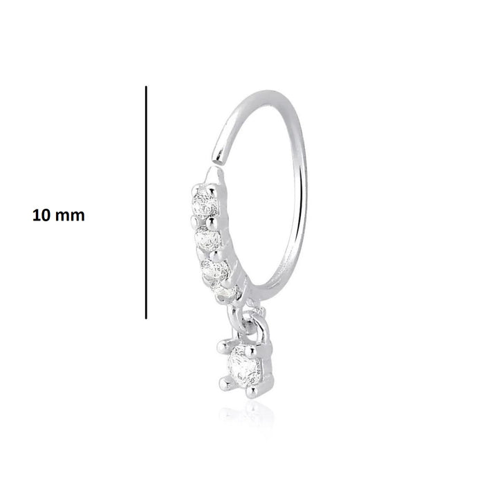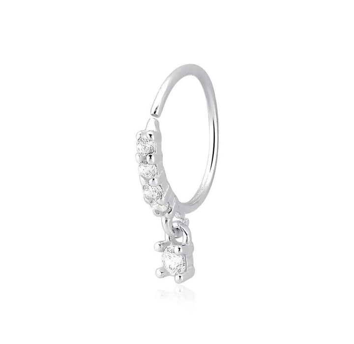 Piercing em Prata 925, modelo argola delicada com acabamento polido, inteiramente cravejada com micro zircônias brilhantes, que garantem um toque de luxo e sofisticação. Possui um pingente pendurado que confere movimento e charme extra à peça, tornando-a perfeita para compor produções modernas e elegantes. Ideal para quem busca um acessório versátil, com brilho intenso e a durabilidade da prata legítima.